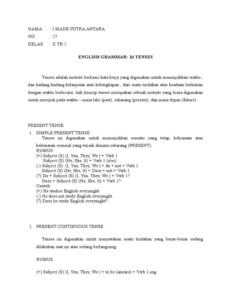 9 rahasia pintar ngomong bahasa inggris dalam 120 hari. Dengan latihan yang rutin, maka kamu dapat menguasai bahasa inggris dalam waktu beberapa bulan saja. Sedangkan has digunakan untuk subjek seperti she,he, it, dan subjek lainnya yang tunggal. Reported speech dalam bentuk present. Ada 3 kelompokkan kata ganti dalam bahasa inggris, yakni kata ganti orang, kata ganti kepemilikan, dan kata ganti penegasan. Digunakan untuk subject you, we, they. Tenses bahasa inggris sendiri dapat dibagi menjadi 3 bagian utama yakni : Pada postingan ini kita akan membahas perbedaan dan penggunaan. Have, has, dan had selalu diikuti oleh past participle dari kata kerja utama. Simple present tenses tenses ini digunakan untuk menyatakan sesuatu yang bersifat tetap, kebiasaan atau kebenaran yang hakiki. Announement atau pengumuman adalah pernyataan ( pemberitahuan resmi) dalam bentuk lisan atau tulisan yang berisi sesuatu untuk diketahui oleh orang banyak. Question tag adalah pertanyaan pendek yang ditambahkan di akhir pernyataan (declarative sentence) untuk menanyakan informasi atau meminta persetujuan. Has digunakan kalau subyek dari kalimatnya adalah she, he, dan it.